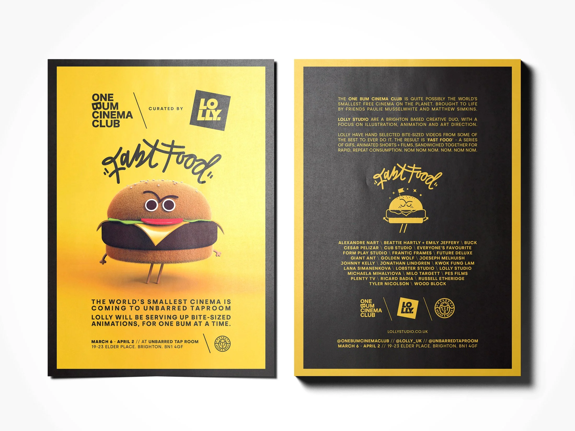 One Bum Cinema asked Lolly to curate an event at Unbarred Brewery, showcasing the best food themed shorts from some of the best animators in the industry. The result was a month long event called Fast Food. I also created the character and event design work.